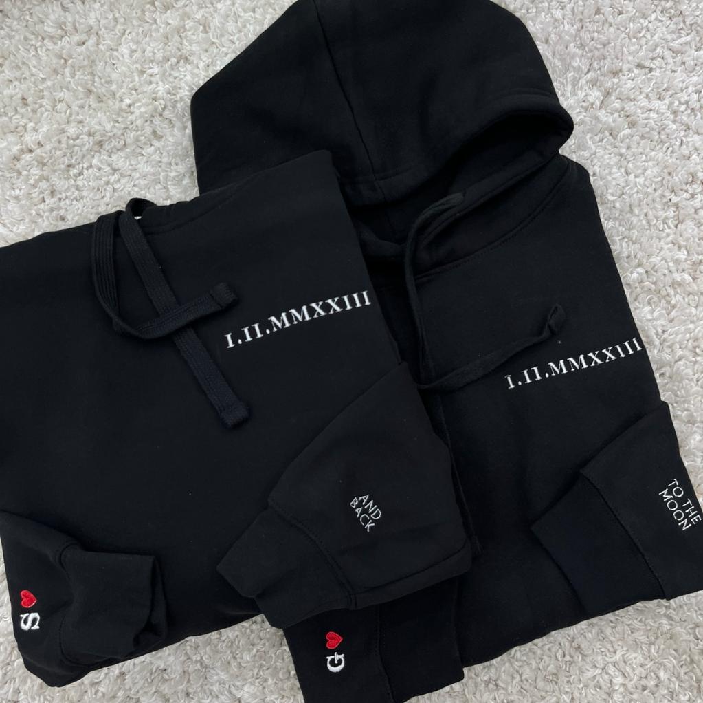 One Custom couple sweater with roman numeral on left chest and initial and heart on Sleeve cuff