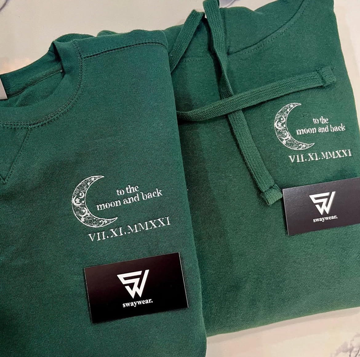 One custom sweater with moon design and roman numeral under design on left chest. Intials and heart on Sleeve cuff